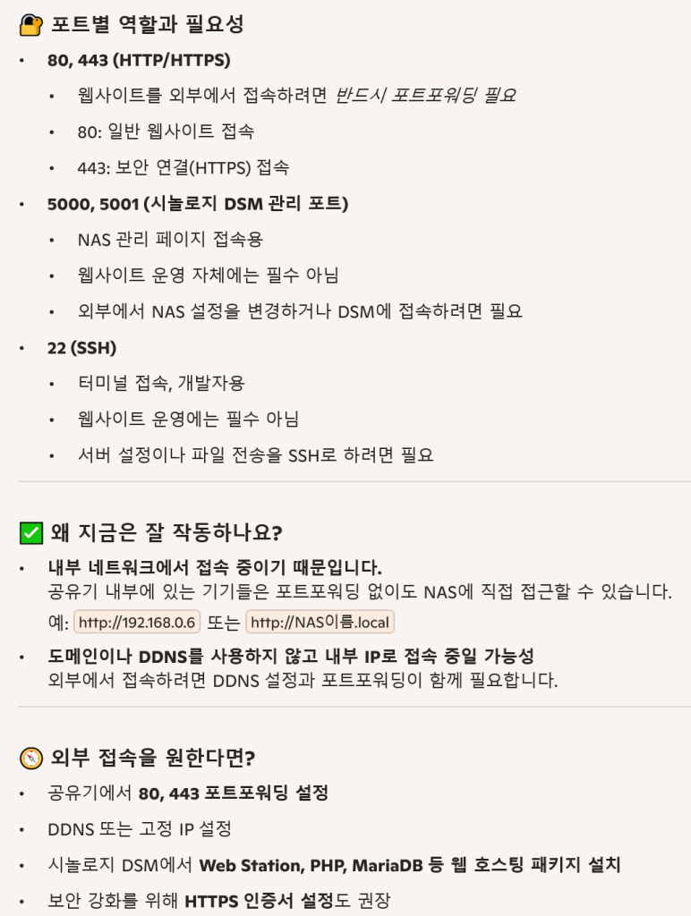 만약 포트포워딩이 설정되지 않으면, 외부에서 아무리 IP나 도메인을 입력해도 내부 NAS까지 요청이 도달하지 않아 웹사이트 접속이 불가능합니다.