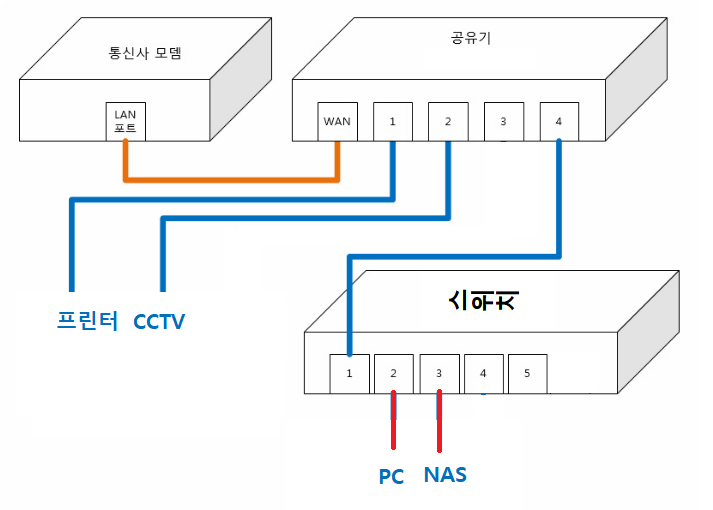 즉, 단순한 파일 공유나 인터넷 접속 정도라면 공유기로 충분하지만, NAS 기반 웹 서버 + 여러 장비 + 안정적 운영을 원한다면 스위치(분배기) 를 추가하는 것이 일반적입니다.